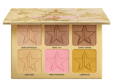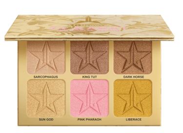 Features 6 stunning highlighter shades including Sarcophagus, King Tut, Dark Horse, Sun God, Pink Pharaoh, and Liberace for versatile face and body application. High-impact, long-lasting highlighter formula delivers an intense metallic finish with minimal product needed.